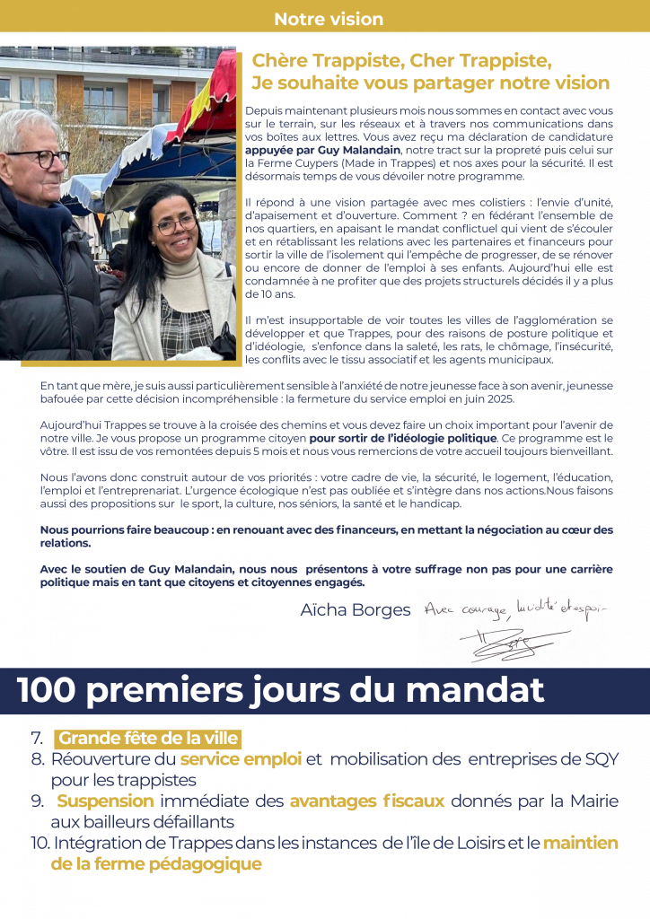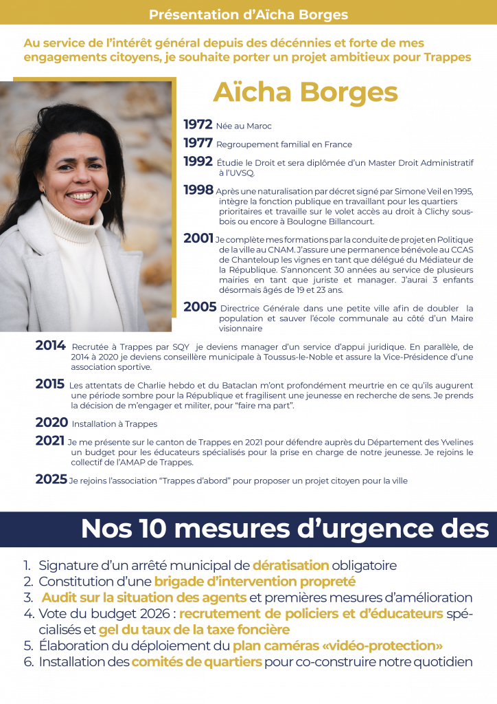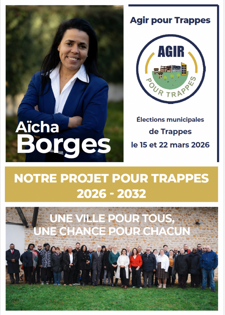 Bienvenue sur le site internet de la liste municipale AGIR POUR TRAPPES portée par Aïcha Borges. Vous trouverez toutes nos rubriques dans le sommaire. Le programme est disponible en dessous. Nous vous souhaitons une bonne visite et restons à votre disposition ! Et rendez-vous le 15 mars 2026 prochain pour exprimer votre voix dans les urnes !